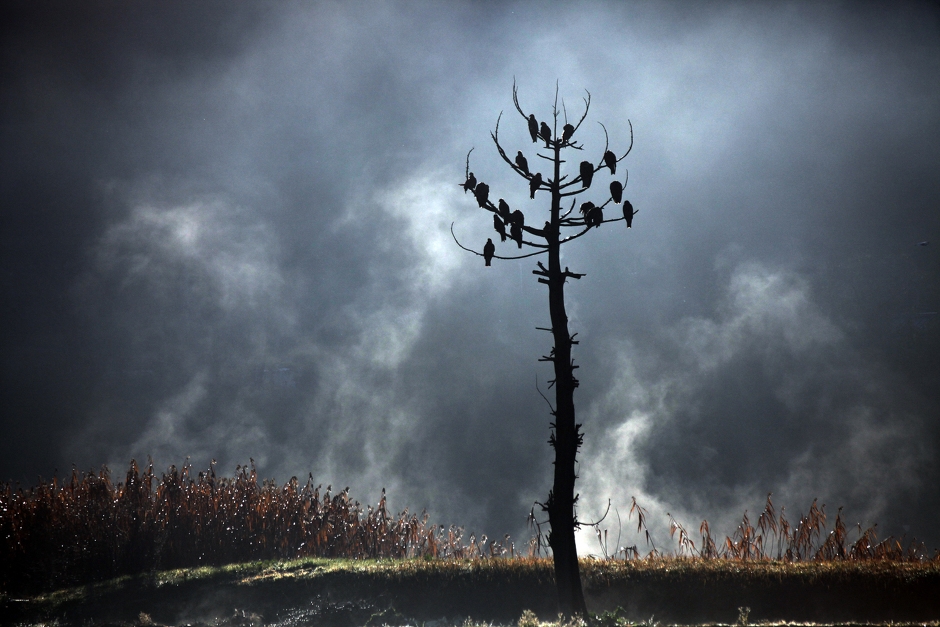 枝と枝がぶつかり合う強い風に耐える 樹木たち。